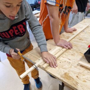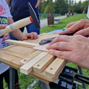 • Praca z prawdziwymi narzędziami: Pod okiem instruktorów uczestnicy uczą się bezpiecznie i prawidłowo posługiwać miarką, piłą, młotkiem czy wkrętarką.