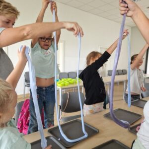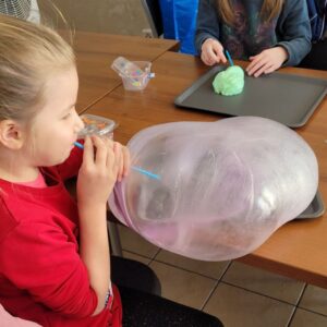 Nauka przez doświadczanie: Przeprowadzamy spektakularne i bezpieczne eksperymenty. Dzieci uwielbiają nasze zabawy z cieczą, tworzenie kolorowych slajmów czy niesamowite pokazy typu „bańka w bańce”.