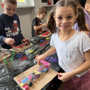 • Kreatywne projekty z drewna: Samodzielnie odmierzamy, piłujemy, szlifujemy i łączymy elementy. Wspólnie tworzymy fantastyczne, własnoręczne konstrukcje – od drewnianych pojazdów i zwierzaków, przez karmniki, aż po użyteczne gadżety, które uczestnicy zabierają do domu.